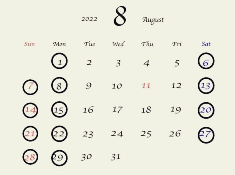 8月の営業日