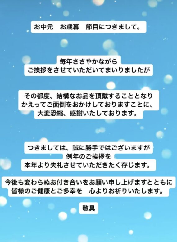 202406.08 INFORMATION 節目、お中元、お歳暮について。 今後共、変わらぬお付き合いの方頂けるだけで何より嬉しく思います。 お客様をはじめ、関係者各位様 いつも、本当に有難うございます。
